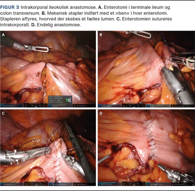 Ved coloncancer formodes robotkirurgi også at facilitere præcis onkologisk dissektion med central kardeling og lymfeknudeexcision samt at facilitere den tekniske udførelse af intrakorporal anastomose [10]. Ved intrakorporal anastomose forstås, at anastomosen laves med minimalt invasiv teknik (inklusive intrakorporal suturering), uden at tarmene bringes uden for maven (ekstrakorporalt) (Figur 3). Der foreligger et enkelt mindre RCT [3] om højresidig hemikolektomi, hvor man fraset øgede omkostninger og forlængelse af operationstiden ved robotkirurgi ikke har fundet nogen forskelle. I den benigne nedre kirurgi anvendes den robotkirurgiske tilgang særligt ved operation for rektalprolaps (rektopeksi med meshfiksering af rectum), som kræver intrakorporal suturering i de snævre pladsforhold i bækkenet. Evidensen er begrænset og har foreløbigt ikke påvist en forskel mellem robotkirurgi og laparoskopi [11].