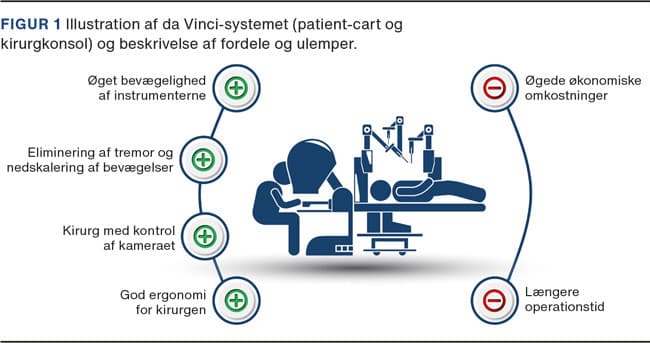 Det langt mest udbredte robotkirurgiske system er da Vinci Surgical System, og begrebet robotkirurgi bruges for nuværende synonymt med da Vinci-systemet. Da Vinci-systemet består af en patientdel, som udgør de mekaniske arme, hvorpå de robotkirurgiske instrumenter monteres, og en kirurgkonsol, hvorfra kirurgen styrer alle bevægelser (Figur 1). Det baserer sig grundlæggende på de samme kirurgiske principper og teknikker som konventionel laparoskopisk kirurgi, men bevægefriheden er øget markant grundet en mekanisk artikulering i spidsen af instrumenterne. Robottens tekniske fordele formodes at facilitere teknisk udfordrende dele af operationen, såsom intrakorporal suturering og dissektion under snævre pladsforhold, samtidig med at der er klare ergonomiske fordele for kirurgen sammenlignet med laparoskopi og åben kirurgi [2].
