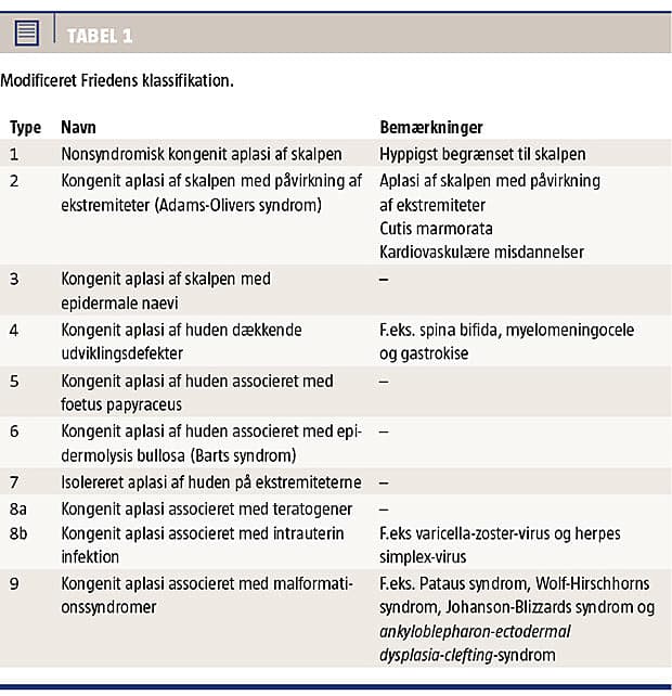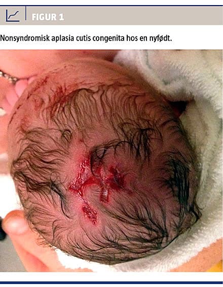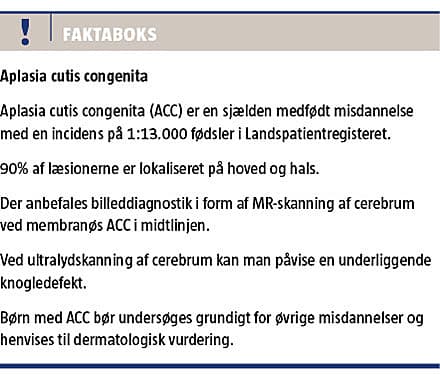 Aplasia cutis congenita (ACC) er en medfødt defekt af huden. Læsionerne er ikkeinflammatoriske, skarpt demarkerede og varierer i form og størrelse (typisk fra 0,5 cm til 10 cm) [1]. Kasuistisk er der beskrevet enkelte tilfælde af systemisk ACC, men 80-90% af tilfældene er begrænset til skalpen [1, 2]. Læsioner kan involvere både epidermis, dermis, subcutis, periost, knogler og dura mater [3]. ACC kan være associeret med andre alvorlige misdannelser eller være led i et syndrom. ACC er sjældent forekommende, men internationale opgørelser over ACC-incidens indikerer, at tilstanden er underdiagnosticeret eller underrapporteret i Danmark. Formålet med denne statusartikel er at øge kendskabet til ACC og at give retningslinjer for udredning og behandling.
