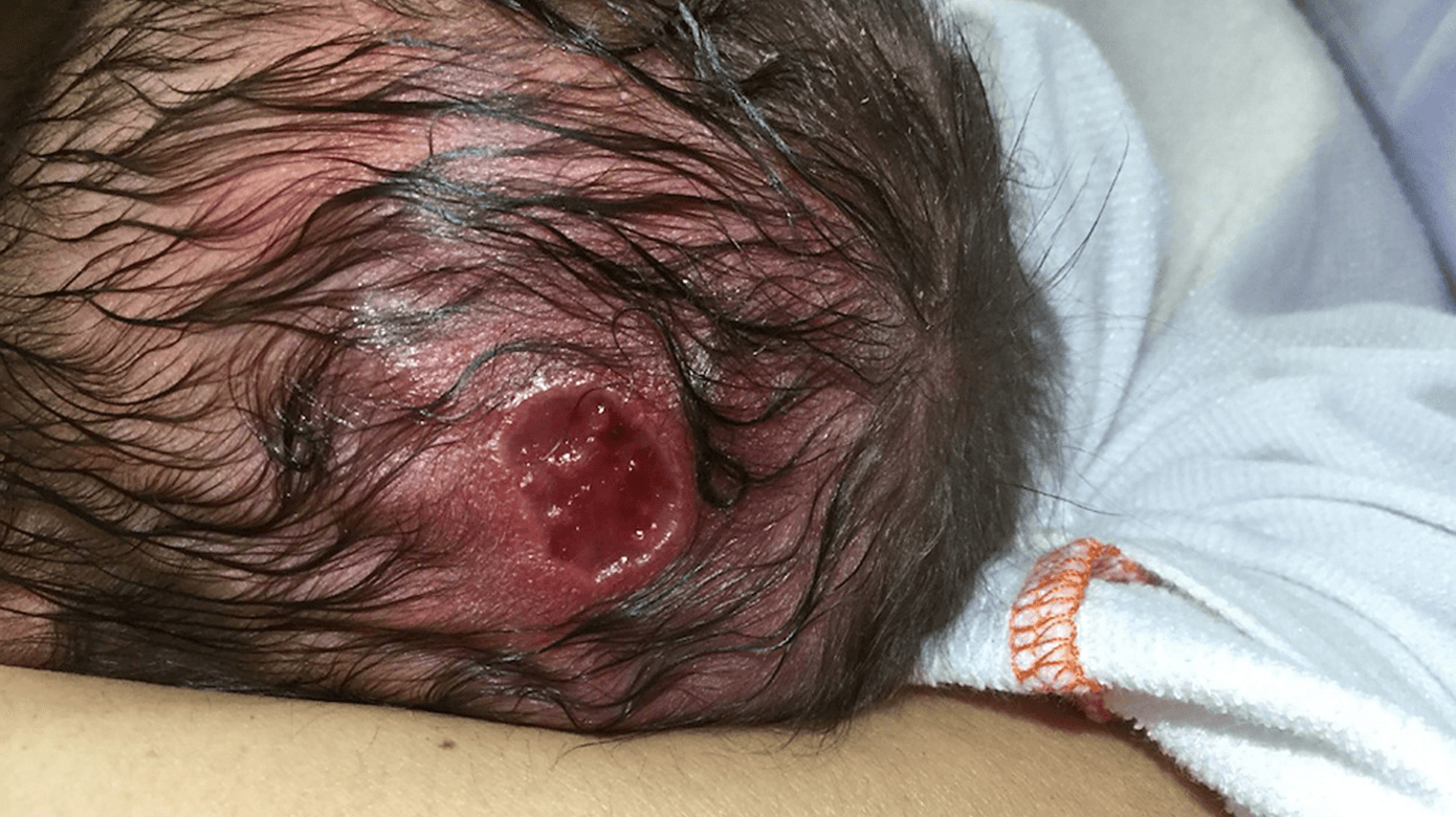 På en nyfødt fandtes et 11 × 12 mm sår occipitalt i midtlinjen kaudalt for den trekantede fontanelle. Barnet var født maturt efter en ukompliceret graviditet. UL-skanning viste mulig mangel på underliggende kraniedække og mulig duradefekt. MR-skanning viste kutan og mulig ossøs defekt med indtryk af duradækning over upåfaldende sinus sagittalis. Barnet blev konservativt behandlet, og såret helede spontant efter to uger.