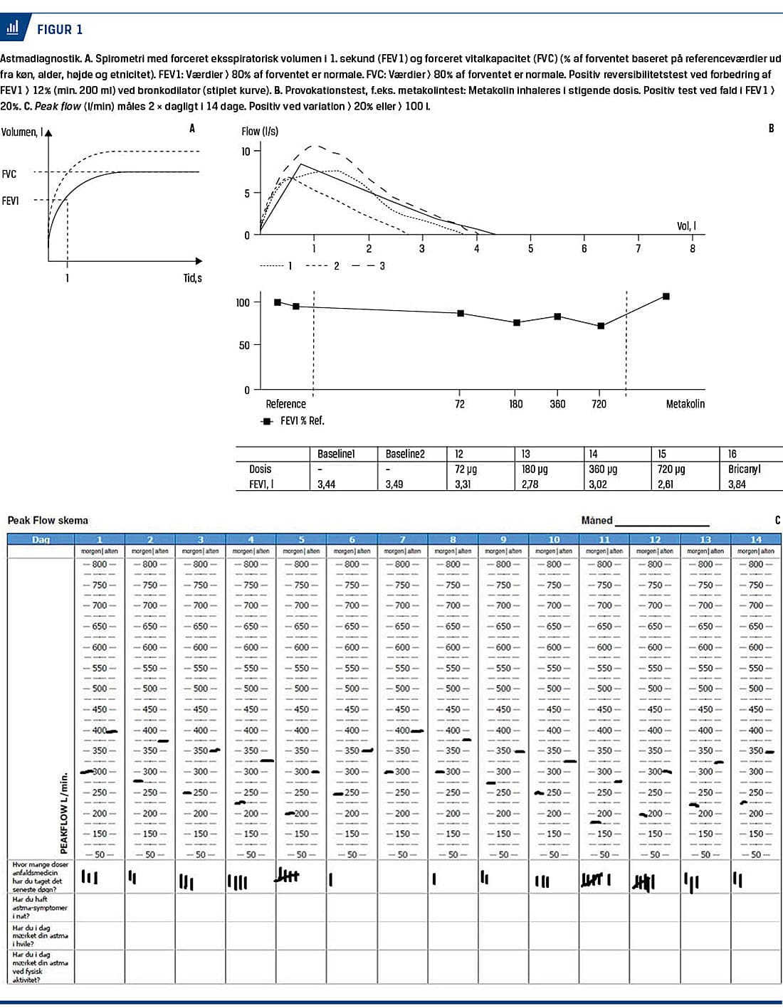 Her blev der målt gentagne spirometrier med forceret eksspiratorisk volumen i første sekund (FEV1) på 87-108% af forventet værdi og en ratio mellem FEV1 og forceret vitalkapacitet > 70% (Figur 1A). Begge disse målinger gav således normale resultater. Diffusionskapaciteten var let nedsat til 82%, volumenkorrigeret. Der blev udført test for allergenspecifikt immunglobulin E for pollen, husdyr, husstøvmider og skimmelsvampe samt for hønseæg, komælk, torsk, hvede, jordnødder og sojabønner, alle var negative. Derudover blev niveauet af eosinofile leukocytter målt, og det var normalt. Herefter udførtes en metakolinprovokationstest (Figur 1B), hvor patienten ved inhalation af 180 mikrogram reagerede med astmasymptomer.