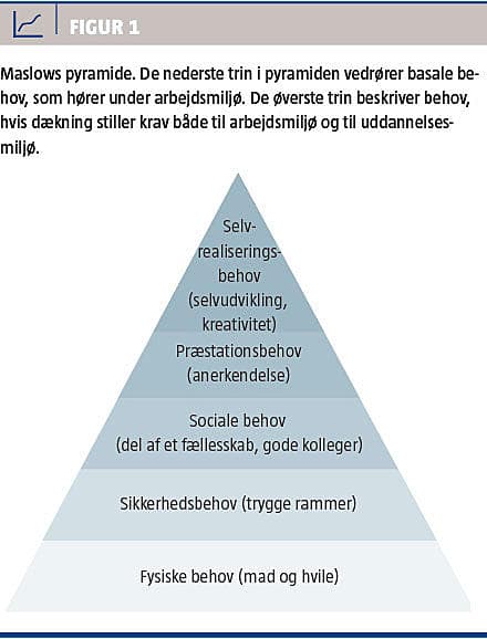 Maslows pyramide har været meget anvendt til at illustrere motivationsbehov i arbejdslivet. De nederste trin (mad og sikkerhed), vil de fleste da også med rette mene, er noget, der skal være opfyldt som del af ethvert ordentligt arbejdsmiljø. De øverste trin (anerkendelse, respekt og selvrealisering) derimod er forhold, som i høj grad beror på et godt uddannelsesmiljø. I måleredskaberne til at vurdere uddannelsesmiljø indgår der da også flere spørgsmål, som netop vurderer dette. Vigtigheden af tilhørsforhold afspejles i måleredskabet PHEEM i spørgsmålet om, hvorvidt man føler sig som del af et team. Behovet for anerkendelse afspejler sig i flere af måleredskaberne i spørgsmål om, i hvilken grad man føler sig respekteret og anerkendt og oplever, at man får både positiv og negativ feedback. Dækningen af behov i pyramidens top er betinget af opfyldelsen af behovene på de lavere trin. I en nylig dansk, ikkevidenskabelig undersøgelse af lægers oplevelse af arbejdsmiljø og uddannelsesforhold udtrykte forfatterne forundring over, at der tilsyneladende var mange basale forhold, som ikke var i orden, f.eks. adgang til at kunne købe mad, når man havde vagt [18]. Sådanne basale udækkede behov kan forstyrre læringsmiljøet, når man betragter det ud fra Maslows motivationsteori. De basale be-
