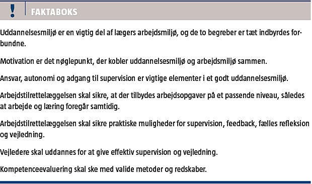 Lægers opfattelse af uddannelsesmiljø er afgørende for deres tilfredshed og glæde ved arbejdet. Et godt uddannelsesmiljø kendetegnes ved, at uddannelsen er tænkt ind i arbejdstilrettelæggelsen, så det er praktisk muligt at give supervision og feedback. Oplevelse af teamtilknytning, ansvar, autonomi, anerkendelse og respekt er væsentlige elementer for oplevelsen af et godt uddannelsesmiljø og motiverer til både arbejde og læring.