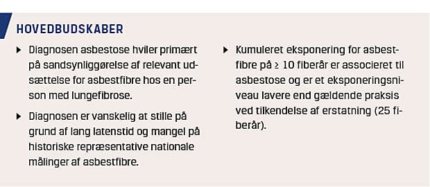 Baseret på det eksisterende datagrundlag er et kumuleret asbesteksponeringsestimat på > 10 fiberår et logisk eksponeringskrav til diagnosen asbestose.