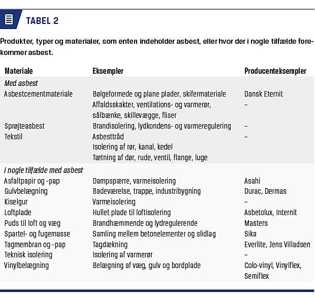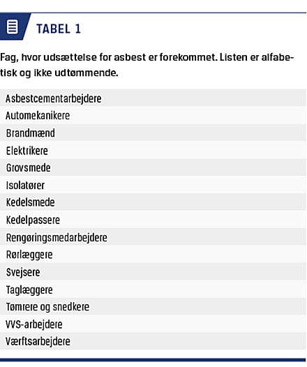 Diagnosticering af asbestose hos den enkelte patient afhænger af, at pågældende kan huske at have arbejdet med asbest. Dette kan for den enkelte patient være svært pga. den lange latenstid fra eksponeringsstart til diagnosetidspunkt [3]. Desuden kan det være svært at erindre de pågældende ansættelser, og i hvor lang tid samt på hvilken måde asbestudsættelsen er foregået. Trods mangel på danske historiske asbestmålinger foreligger der et betydeligt kendskab til arbejdssteder, materialer og processer, hvori asbest har indgået, hvilket af og til kan være til hjælp for patientens hukommelse [8]. I Tabel 1 vises fag, hvor udsættelse for asbest er forekommet, og i Tabel 2 vises produkttyper og materialer med indhold af asbest.