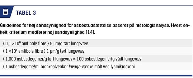 I erkendelse af en ikke ubetydelig usikkerhed ved eksponeringsestimater, der er baseret på luftmålinger, er målinger i målorganet lunge og lungehinder et alternativ. I en konsensusrapport fra 2015 [14] angives det, at en histologidiagnose af asbestose kræver et billede af diffus interstitiel fibrose i et godt præparat, mindst to asbestoselegemer pr. cm2 snit og det antal nøgne fibre, som if. analyselaboratoriet er tilstrækkeligt for at udvikle asbestose. I rapporten angives histologivariable, som afspejler en høj sandsynlighed for asbesteksponering (Tabel 3).
