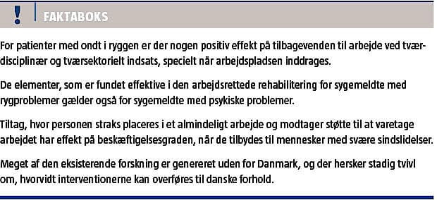 Overordnet er målet med arbejdsrettet rehabilitering at reducere antallet af borgere med helbredsbetingede funktionsbegrænsninger uden for arbejdsmarkedet [20]. Forskningen i TTA har været fokus for en lang række internationale studier siden midten af 1960’erne [21]. Siden 1980’erne har der været et øget fokus på tværfaglige interventioner, men der er ikke fundet entydig evidens for, at en tværfaglig arbejdsrettet rehabiliteringsindsats er effektiv over for længerevarende sygefravær [22, 23]. Når det gælder tværdisciplinær og tværsektoriel indsats over for patienter med ondt i ryggen, er der nogen positiv effekt på TTA, specielt når den sygemeldtes arbejdsplads også inddrages i indsatsen [22-24]. Ligeledes er der en vis evidens for, at elementer, som er fundet effektive i den arbejdsrettede rehabilitering anvendt over for sygemeldte med rygproblemer, også er effektive, når det gælder sygemeldte med psykiske problemer [25, 26]. Imidlertid er meget af den eksisterende forskning udenlandsk, og der hersker stadig tvivl om, hvorvidt interventionerne kan overføres til danske forhold. Ved det store danske nationale TTA-projekt [27], hvor man afprøvede en systematisk, tværfaglig og teambaseret tilgang i 22 kommuner, kunne der efter en relativ kort opfølgningstid ikke påvises en entydig effekt på TTA af den afprøvede samarbejdsmodel i forhold til sygefravær (på tværs af diagnoser) [27]. Skønt evalueringen endnu ikke er afsluttet har væsentlige elementer i projektet inspireret til den ny fleksjob- og førtidspensionslovgivning.