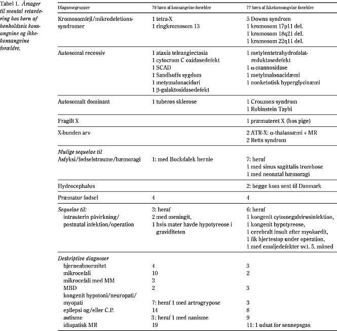 Vi fandt kun sikre og mulige ætiologiske forklaringer på MR hos 17 ud af 79 børn med konsangvine forældre (21,5%) og hos 37 ud af 77 med ikkekonsangvine forældre (49%), de resterende diagnoser var udelukkende deskriptive. Endnu ukendte recessive gener kan tænkes at spille en rolle.