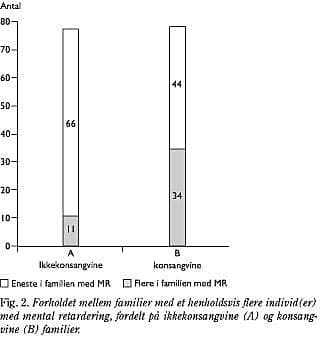 I gruppen af børn med konsangvine forældre fandt man hos 34 ud af 79 (43%) andre personer med MR/MM i familien. Seksogtyve børn havde søskende med MR, hos tre forelå oplysning om MR hos fætre. Hos fem var en af forældrene mentalt retarderet (en mor og fire fædre). I gruppen af ti børn med primær mikrocefali forelå der oplysning om MR hos seks slægtninge, heraf tre hos søskende og tre hos fætre.
