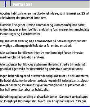 Abortus habitualis (AH) defineres som tre på hinanden følgende ufrivillige graviditetstab fra uterus, før fosteret er levedygtigt - dvs. før uge 22 + 0 [1]. Klinisk inddeles AH i tre former: 1) primær AH, hvor kvinden udelukkende har haft aborter, 2) sekundær AH, hvor kvinden efter en fødsel oplever en række aborter, og 3) gentagne senaborter, hvor kvinden har mindst to på hinanden følgende aborter efter uge 12 + 0 [1]. Tilhører en patient en af disse tre grupper, bør man udrede for AH. Det kan med fordel foregå som et samarbejde mellem almen praksis, gynækologiske speciallæger og fertilitetsklinikker med særlig interesse for emnet.