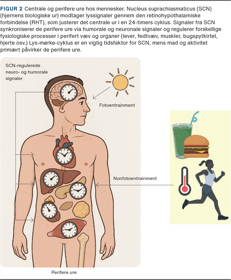 Som en del af livet på jorden har alle levende individer tilpasset sig til skiftet mellem dag og nat betinget af jordens rotation omkring sin egen akse i forhold til solen. Længden af denne periode svarer til det astronomiske døgn på 24 timer. For mennesker deler lys og mørke således døgnet i en aktiv fase med lys samt en passiv fase med mørke. En række fysiologiske og adfærdsmæssige faktorer ændres rytmisk over døgnet, hvorved der skabes de optimale omstændigheder for bl.a. fødeindtagelse, reproduktion og søvn. Systemet, som styrer fysiologi og adfærd, kaldes det circadiane system. Døgnrytmeforskning har kortlagt systemet fra molekyle til adfærd og blev belønnet med Nobelprisen i medicin i 2017 [4]. Systemet består grundlæggende af hjernes biologiske ur, »masteruret«, nucleus suprachiasmaticus (SCN) beliggende i hypothalamus. Herfra udgår signaler til resten af kroppens organer og celler, som indeholder egne biologiske ure [5]. De molekylære komponenter i masteruret og i de perifere ure er de samme, nemlig en gruppe af såkaldte transskriptionsfaktorer, populært benævnt »klokkegener« [5]. Masteruret kan opfattes som en dirigent i et orkester, der dirigerer kroppens perifere ure, så organ- og vævsure er i fase. De enkelte ure synkroniseres med forskellig hastighed, hvilket ved rejser over flere tidszoner giver forstyrrelser (jetlag)/symptomer (Figur 2).
