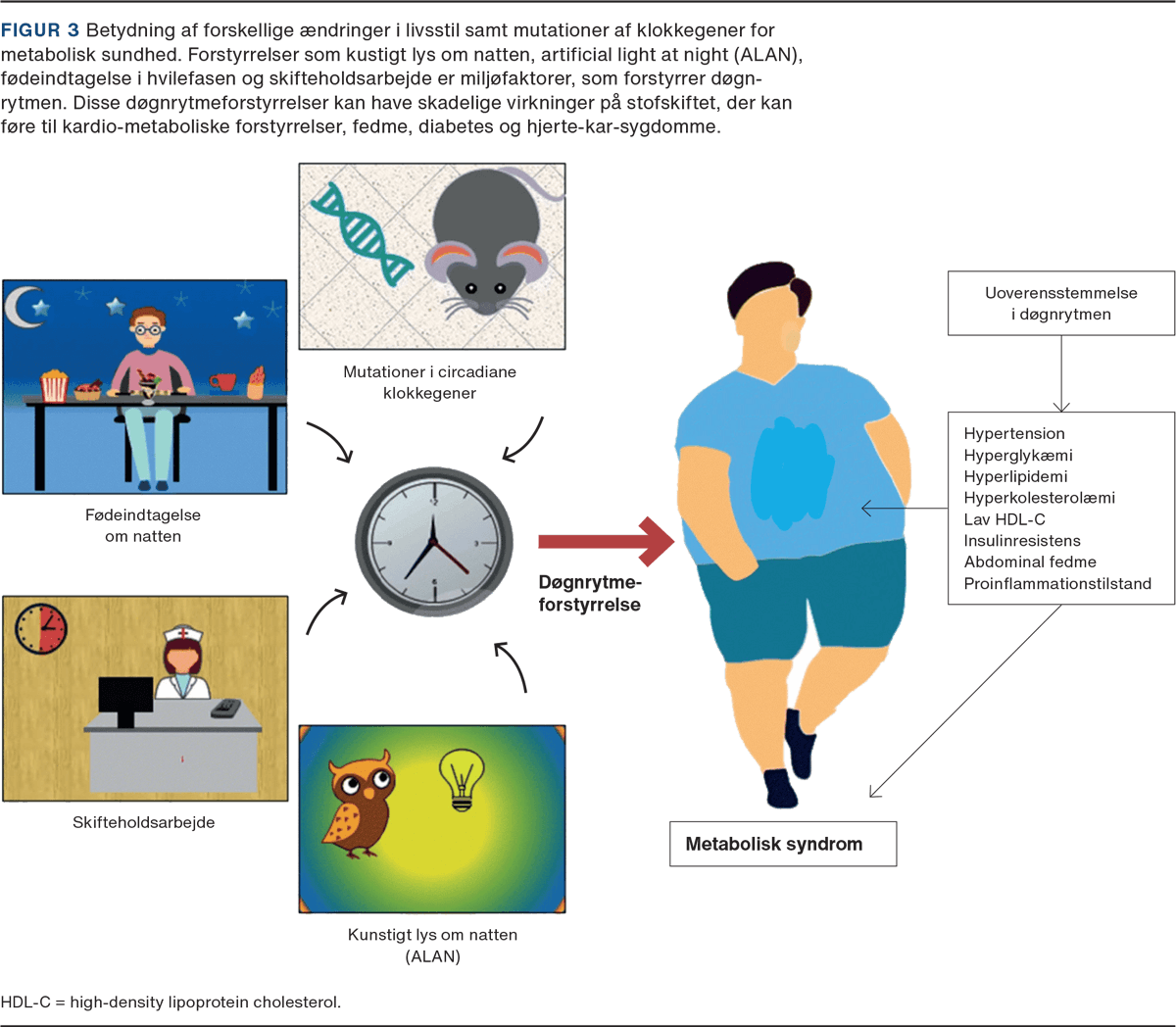 En længerevarende forstyrrelse af synkroniseringen mellem det indre ur og nonfotiske tidsgivere kan resultere i forstyrrelse af det circadiane system [11]. Dette kan være en følge af fødeindtagelse om natten, idet metabole processer i bl.a. lever, tarm og endokrine kirtler medvirker til den metaboliske homøostase [9]. Studier tyder på, at en længerevarende circadian disruption af de metabole processer øger risiko for udvikling af sygdomme som diabetes, fedme, metabolisk syndrom og kardiovaskulær sygdom (Figur 3) [12, 13]. Undersøgelser af gen- og proteinekspression har vist, at mere end 50% af leverens gener udviser døgnrytmeændringer, og at en forstyrrelse i disse geners udtryk og deraf metabole ændringer kan korreleres til udviklingen af metabole forstyrrelser/metabolt syndrom [14, 15].