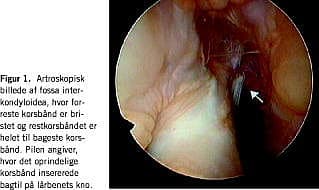 Første fase omfatter en grundig stabilitetsanalyse af det relakserede knæ og en diagnostisk artroskopi. Det er af afgørende betydning, at læsion af knæleddets øvrige ledbånd diagnosticeres. Løshed af sideledbånd og tilstødende kapselstrukturer skal behandles samtidig. Ligeledes skal meniskskader og bruskskader diagnosticeres og behandles (Figur 1 ).