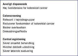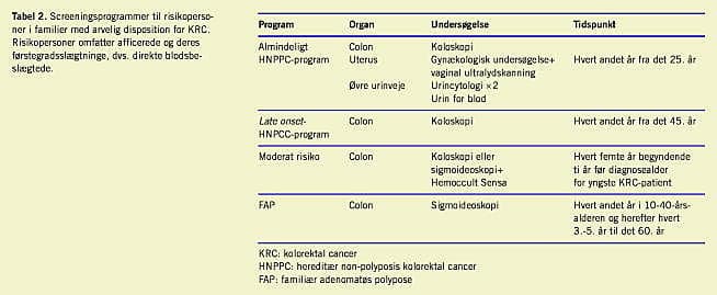 Colonscreening i familier, der er arveligt disponeret for KRC, kan reducere både forekomsten og mortaliteten af KRC. Polyposeregistrets arbejde har således reduceret prævalensen af KRC ved FAP med 55%, og overlevelsen er forbedret væsentligt [3]. Erfaringer fra HNPCC-registret viser siden 1990 en signifikant bedre overlevelse efter KRC, og 77% af de KRC'ere, der blev fundet ved screening var i et lokaliseret stadium. Koloskopisk screening i HNPCC-familier er omkostningseffektiv og reducerer forekomsten af KRC med over 60% samt nedsætter mortaliteten. Screening er relevant, også selv om Amsterdam-kriterierne ikke er opfyldt [3].