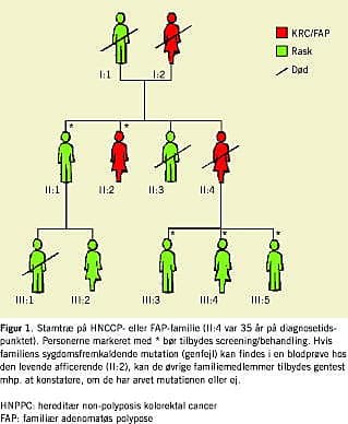 Kolorektal cancer (KRC) er hyppig i Danmark, og livstidsrisikoen er 4-6%. Ætiologien er heterogen, og både miljø og genetiske faktorer har betydning. De hyppigste former for arvelig KRC er hereditær non-polyposis kolorektal cancer (HNPCC) og familiær adenomatøs polypose (FAP), hvor livstidsrisikoen for KRC er 80-100% hos genbærere. Polypose manifesterer sig med multiple adenomer i rectum, hvorfor diagnosen kan stilles ved sigmoideoskopi på den enkelte patient. HNPCC udgør et væsentligt større klinisk problem, da diagnosen ikke kan stilles hos den enkelte patient pga. manglende fænotypiske karakteristika, men må baseres på forekomsten af kræft i familien og stamtræsvurdering (Figur 1 ).