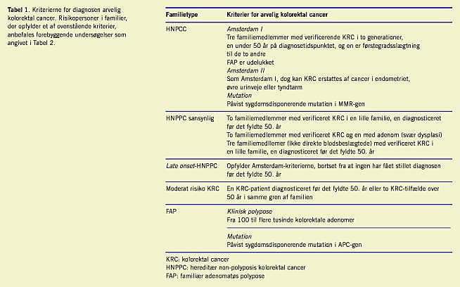 HNPCC defineres til forskningsbrug ved Amsterdam I- og II-kriterierne, som dog er for snævre til identifikation af alle højrisikogrupper, og beslutningen om screening er derfor en vurderingssag (Tabel 1 ).