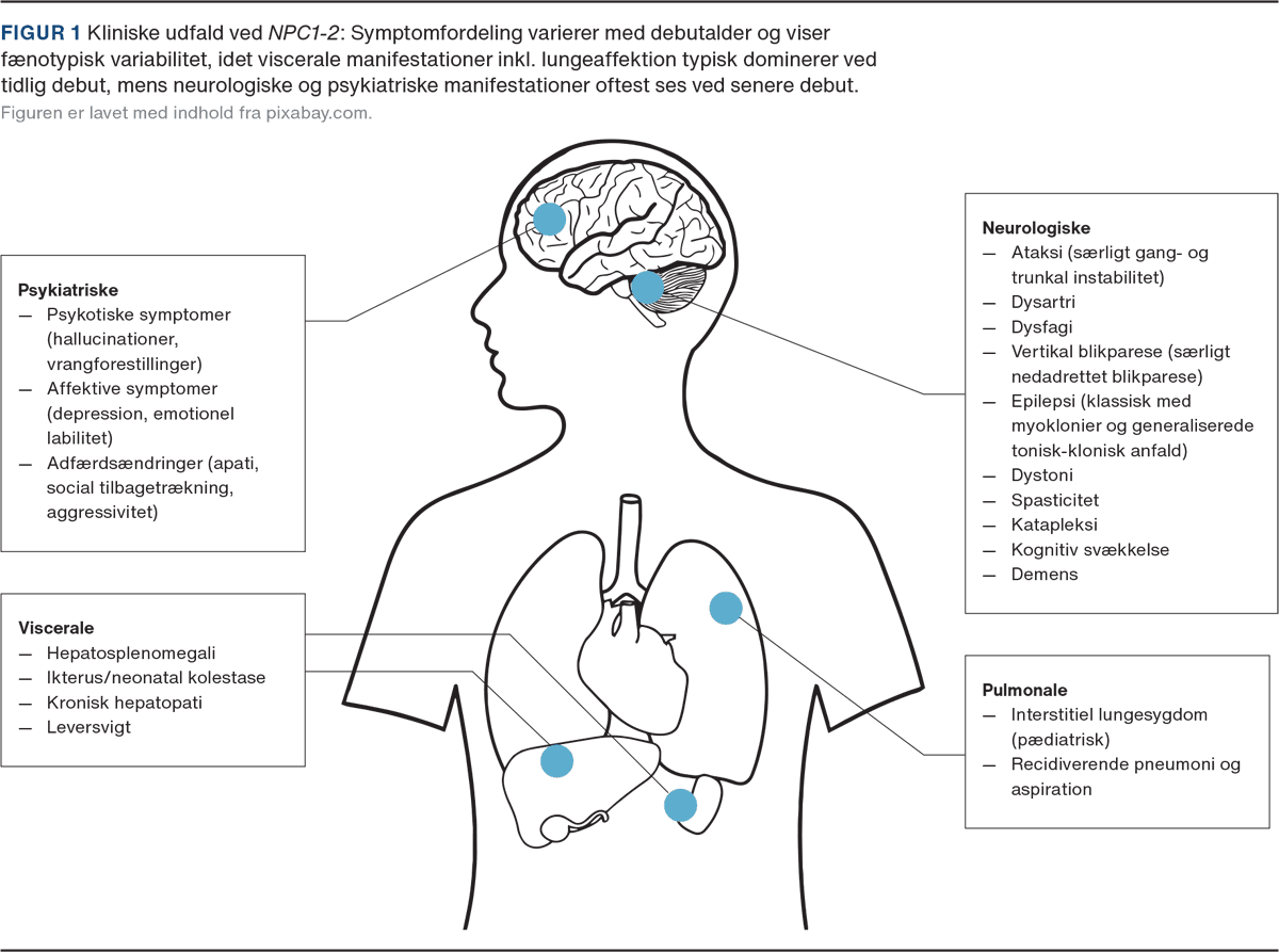 Niemann-Pick type C1 og C2 (NPC1-2) er sjældne, autosomal recessive nedarvede sygdomme med en prævalens på ca. 1:120.000 [1]. NPC1 (MIM 257220) skyldes patogene varianter i NPC1 (MIM 607623), hvilket medfører defekt lysosomal transport af kolesterol og glykosfingolipider, som ophobes i væv med høj metabolisk aktivitet og lipidomsætning, resulterende i cellulær dysfunktion [2]. Sygdommen involverer primært lever, milt, hjerne og lunger (Figur 1) og manifesterer sig med symptomer fra selvsamme organsystemer med fænotypisk variation [3]. I ca. 15% af tilfældene debuterer sygdommen i voksenalderen [4].