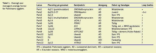 Hvis man skal følge de internationalt anerkendte diagnostiske kriterier for PS, UK Brain Bank criteria, helt stringent, er mere end en afficeret slægtning et eksklusionskriterium for diagnosen PS, men i de fleste studier ser man bort fra dette kriterium, og parkinsonisme med monogen arvegang med mutation i Park-loci medregnes som PS (Tabel 1 ), mens andre monogent arvelige tilstande, der kan have en fænotype med parkinsonisme, f.eks. dopa-responsiv dystoni og visse former for spinocerebellar ataksi, ikke inkluderes. Klassifikationen er således vanskelig, og på fænotypen alene kan man ikke skelne mellem arvelig og idiopatisk, formodet multifaktoriel forårsaget PS. Endvidere er selv de formodede monogent nedarvede former for PS måske led i mere komplekse årsagssammenhænge mellem genetik og miljø, hvilket specielt forholdene ved LRRK2 (Park8) tyder på.
