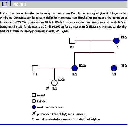 Det er ikke altid muligt at identificere den sygdomsdisponerende mutation i en familie, selv om stamtræet er foreneligt med monogen arvegang. Det udelukker ikke forekomst af et arveligt cancersyndrom, idet langtfra alle cancerdisponerende gener er identificeret. En dansk undersøgelse har vist, at det kun er muligt at finde en BRCA1/2 -mutation hos 28% af de familier, hvor stamtræet tyder på arvelig mammacancer [7] (Figur 1 ). Når der påvises en sygdomsdisponerende mutation i en familie, vil alle slægtninge kunne tilbyd es prædiktiv (præsymptomatisk) gentest for denne mutation. Herved vil ca. 50% af de nære slægtninge blive frikendt for familiens mutation og den forhøjede cancerrisiko.