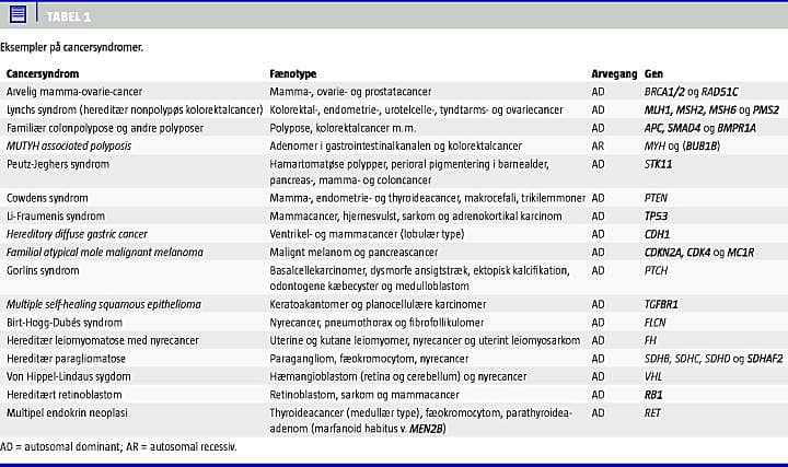 Arvelige cancersyndromer er eksempel på subklassifikation af sygdomme baseret på den molekylære patogenese. Der ses f.eks. øget risiko for mammacancer ved en række cancersyndromer. Det er karakteristisk, at der kan forekomme øget risiko for flere cancere ved et cancersyndrom (Tabel 1 ), og der er øget hyppighed af bilaterale/synkrone cancere, ofte med tidlig debut. Ved nogle cancersyndromer ses også andre symptomer end cancer som f.eks. Cowdens syndrom, hvor makrocefali og hudmanifestationer er karakteristisk.