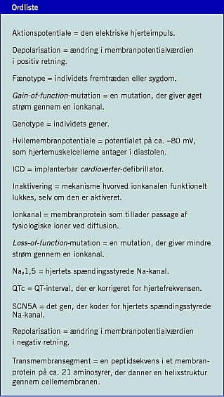 Summary Inherited cardiac diseases caused by Nav1.5 sodium channel mutations Ugeskr Læger 2009;171(15):1261-1265 Contraction of the heart is achieved through a delicately regulated conduction of electrical impulses. A pivotal element in the impulse propagation is the depolarising sodium current responsible for the initial depolarisation of the cardiomyocytes. Recent research has shown that mutations in the gene encoding the cardiac sodium channel (SCN5A) is associated with both rare forms of ventricular arrhythmia, and with the most frequent form of arrhythmia, atrial fibrillation.