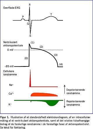 Menneskets hjerte trækker sig sammen mere end 2,5 mia. gange i løbet af et normalt liv. Kontraktionen af hjertemuskulaturen sker som følge af en elektrisk impuls - benævnt hjertets aktionspotentiale - der dannes i pacemakercellerne i sinusknuden øverst i højre atrium. Det dannede aktionspotentiale udbredes derefter gennem atrierne til AV-knuden og videre til ventriklerne gennem det specialiserede ledningssystem, der udgøres af His bundt, grenbundterne og purkinjefibrene. Aktionspotentialet giver anledning til en ændring i spændingsforskellen over cellemembranen fra -85 mV til 20-30 mV i de ca. 300 ms impulsen varer (Figur 1). Ionstrømmen kan måles med elektroder på kroppens overflade, hvor mængden af depolariserende og repolariserende hjertevæv (se ordforklaring) samt retningen af vektoren er bestemmende for den målte amplitude. I et elektrokardiogram (EKG) repræsenterer P-takken således depolariseringen af atrierne, mens QRS-komplekset tilsvarende svarer til depo-lariseringen af ventriklerne, og T-takken afspejler repolariseringen af ventriklerne.