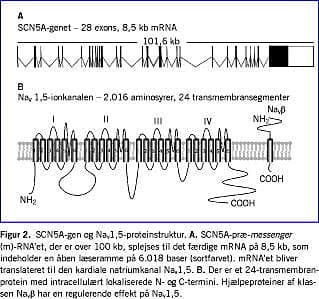 Hjertets natriumstrøm, der er essentiel både for initieringen af aktionspotentialet og for spredningen af den elektriske impuls, ledes igennem natriumkanaler af typen Nav 1,5. Kanalerne kodes af SCN5A-genet, der er lokaliseret på kromosom 3 (Figur 2). Efter aflæsning af genet spænder SCN5A's præ-messenger-RNA sig over mere end 100 kilobaser (kb) og efter splejsning (enzymatisk fjernelse af ikkekodende RNA-fragmenter) af de 28 exoner (den kodende del af genet), er det færdigprocesserede messenger-RNA 8,5 kb [3]. Det resulterende Nav 1,5-protein er et stort glykosyleret cellemembranbundet protein, der består af 2.016 aminosyrer med en molekylevægt på ~220 kilodalton [4]. En funktionel Nav 1,5-kanal er opbygget af fire domæner (I til IV), der hver har seks transmembrane segmenter (TM1 til TM6). Rent biofysisk kan Nav 1,5-natriumkanalen findes i tre tilstande: lukket - ved hvilemembranpotentialeværdier, åben - kortvarigt efter depolarisering, og inaktiveret - ved depolariseringer, der varer længere end 3 ms.