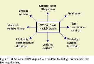 Visse hjertesygdomme skyldes fejl i gener (genvariationer og mutationer), der koder for hjertets proteiner. Mutationer i de strukturelle proteiner - så som sakomerproteinerne - kan medføre kardiomyopatier, hvorimod mutationer, der ændrer funktionen af de proteiner, som er vigtige for hjertets elektriske stabilitet - og dermed funktionen af hjertet - kan medføre sygdomme, der klassificeres som primære elektriske hjertesygdomme. Op mod 200 forskellige punktmutationer i SCN5A eller mutationer i gener, der giver ophav til proteiner, der interagerer med Nav 1,5, er siden 1995 blevet kædet sammen med en række hjertesygdomme [9]. Flere af disse arvelige hjertesygdomme er sjældent forekommende, men for de berørte patienter og familiemedlemmer kan sygdommen have en altoverskyggende virkning, hvilket vil blive i llustreret i det følgende (Figur 3).