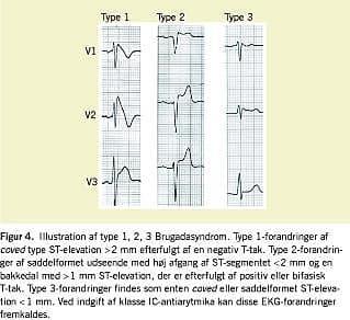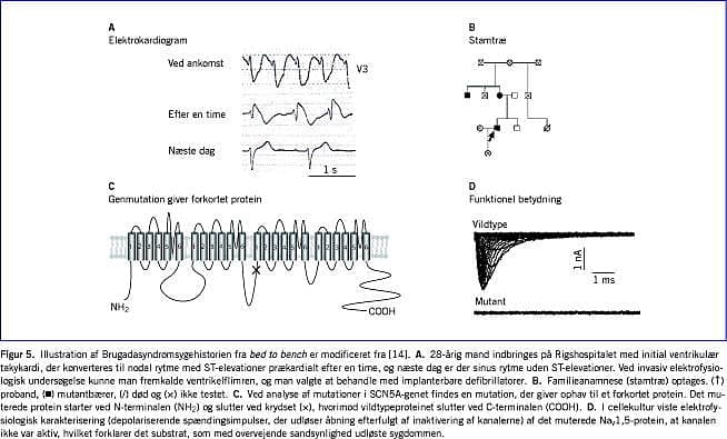 Brugadasyndrom (BrS) er en relativt nyopdaget arvelig primær elektrisk hjertesygdom [12]. BrS-patienter har strukturelt normalt hjerte og karakteristiske EKG-afledninger i form af ST-elevationer i de højresidige forvægsafledninger, der kan ligne forandringerne hos patienter med ST-elevationsmyokardieinfarkt. ST-elevationerne kan være dynamiske, og der er klassificeret tre undertyper (Figur 4). For at opfylde de diagnostiske kriterier for Brugadasyndrom skal der - ud over type 1-EKG-ST-elevation (enten spontant eller udløst ved flecainidtest) være ét positivt fund til stede så som: besvimelse, ventrikelflimren, selvlimiterende polymorf ventrikeltakykardi eller familieanamnese med pludselig hjertedød [13]. Debut er typisk omkring 40 år, og mænd er hyppigere ramt end kvinder (8:1). Sygdommen er særlig hyppig i Sydøstasien. Aryt-mihændelserne finder oftest sted i hvile eller om natten, og temperaturforhøjelse kan være udløsende (Figur 5). I alt 20% af patienterne med Brugadasyndrom har supraventrikulær arytmi, som oftest er i form af atrieflimren (AF). Oprindeligt blev prognosen for Brugadasyndrom anset for at være meget malign, men forskningen har de sidste år nedjusteret denne alvorlige prognose [14]. Eneste behandlingsmodalitet er for indeværende en ICD-enhed. Arvegangen er autosomal dominant med varierende penetrans, og i ~20% af tilfældene skyldes sygdommen mutationer i SCN5A og i sjældnere tilfælde mutationer i GPD1-L, der er involveret i transporten af natriumkanalerne til celleoverfladen, i hjertets spændingsafhængige L-typecalciumkanaler (CACNA1C og CACNB2), samt i hjælpeproteiner til hhv Nav 1,5 og den transient udadgående kaliumkanal Kv4.3 [15-18]. Mutationerne i Nav 1,5 er typisk af typen loss-of-function, hvilket vil sige, at kanalen har en nedsat funktionalitet. De øvrige 70-75% af sygdomstilfældene kan p.t. ikke forklares genetisk. Adskillige internationale forskningsprojekter - herunder et under Danish Arrhythmia Research Centre (DARC) - undersøger i disse år, hvilke andre gener der kunne forårsage Brugadasyndrom ved at screene patientmaterialet for mutationer i andre kandidatgener.