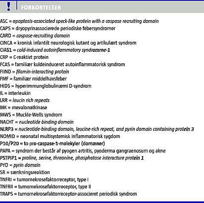 De monogene hereditære periodiske febersyndromer er en samlebetegnelse for en række systemiske autoinflammatoriske sygdomme (se oversigten i Tabel 1 ). Disse lidelser har fået et fundament i de syndromspecifikke gener, der videre har dannet grundlaget for forskningen i patogenesen bag syndromerne og derved skabt koblingen fra genmutation til klinik. Ved FMF og CAPS er dette i store træk klarlagt, men det er i mindre grad tilfældet ved HIDS og TRAPS. Herudover har udviklingen i forståelsen af syndromerne medført nye muligheder inden for behandling: fra brugen af kolkicin ved FMF på baggrund af erfaringer fra kliniske observationer til brugen af IL1-hæmmere ved CAPS ud fra kendskab til patogenesen. Desværre har man endnu ikke for alle monogene febersyndromer fundet en specifik behandling med overbevisende effekt, og hos størsteparten af de patienter, der har periodisk feber, har vi stadig ikke nogen patogenetisk forklaring på, hvorfor feberen optræder. Trods talrige undersøgelser er der ved andre autoinflammatoriske sygdomme som systemisk juvenil idiopatisk artritis, morbus Behçet og PFAPA ikke fundet nogen genetisk årsag.