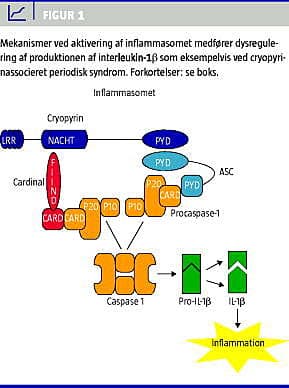 I 1999 fandt man et locus for både FCAS og MWS på kromosom 1q, og i 2001 identificeredes mutationer i et 9-exon gen i såvel FCAS- som MWS-familier [22]. Året efter fandtes mutationer i samme gen hos patienter med CINCA, dog kun hos ca. halvdelen [23]. Genet kaldtes oprindeligt CIAS1 (cold-induced autoinflammatory syndrom-1), senere NAPL3, men har nu betegnelsen NLRP3 (nucleotide-binding domain, leucine-rich repeat, and pyrin domain containing protein 3 , og det koder for proteinet cryopyrin (NLRP3) [24]. Stimulering af cryopyrin medfører dannelse af et makromolekylekompleks, der kaldes »NLRP3-inflammasomet« (Figur 1 ). Den resulterende homooligomerisering af procaspase-1 faciliterer en autokatalytisk dannelse af caspase-1, som igen er ansvarlig for at spalte pro-IL-1β til IL-1β, som er udtalt proinflammatorisk. En mulig forklaring for patogenesen bag CAPS kan være, at NLRP3-genmutationen, der hyppigst sidder i exon 3 (NACHT-domænet), svækker interaktionen mellem inhibitorer og NLRP3, hvorved dannelsen af IL-1β fremmes [18].