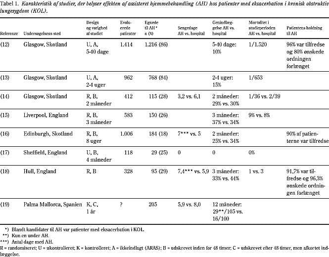 I en spansk undersøgelse af indlagte patienter med eksacerbation i KOL blev AH sammenlignet med standardbehandling (19). En undergruppe alle med passende familiær opbakning og uden komorbiditet indgik i studiet. Undersøgelsens design er dog metodologisk tvivlsomt. Byboere fik tilbudt AH bestående af besøg dagen efter udskrivelse og siden efter behov. I dagtiden kunne patienten ringe til sygeplejersken. Før endelig afsluttet behandling blev patienten set i hjemmet af en læge. Kontrolgruppen bestod primært af landboere. Udskrivelse blev foretaget så tidligt som muligt under hensynstagen til patientens villighed og en klinisk bedømmelse. Indlæggelsen kunne i gennemsnit reduceres med 2,1 dage (p<0,001) mod til gengæld 7,3 dage med AH, 4,8 hjemmebesøg og 2,3 telefonkontakter (Tabel 1). Kun en patient måtte genindlægges under AH.