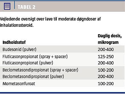 Ved nydiagnosticeret astma anbefales initialt en moderat daglig dosis inhalationssteroid (Tabel 2) i en periode på ca. tre måneder. Den kliniske effekt monitoreres ved spirometri (evt. daglig peak flow-monitorering) samt dagbogsregistreringer af symptomer og behov for β2-agonist. Er optimal kontrol opnået, kan man forsøge at halvere dosis.