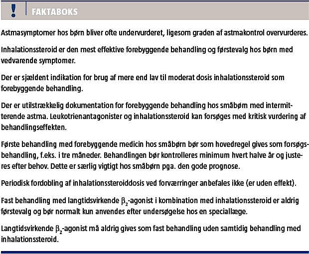 Langt de fleste skolebørn er velbehandlede på en lav til moderat dosis inhalationssteroid, og der er ingen evidens for effekt af højere doser [5, 6]. Hvis der ikke opnås optimal astmakontrol på denne behandling, bør man tjekke komplians, inhalationsteknik og endnu en gang gennemgå patientens miljø med henblik på provokerende faktorer samt overveje, om barnet har rinitis som medvirkende årsag til den manglende kontrol. Hvis ingen af disse kan forklare den utilfredsstillende kontrol, må man genoverveje diagnosen, og børn, der er undersøgt i primærsektoren, skal henvises til en pædiater med særlig viden om astma.
