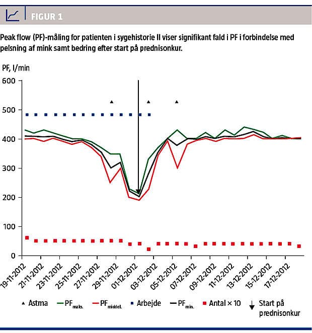 II. En 53-årig kvinde, der var gift med en mink-avler og i seks år havde arbejdet som medhjælper på minkfarmen i pelsningssæsonen, fik i november 2010 for første gang kraftig åndenød med pibende vejrtrækning og tør hoste i forbindelse med pelsning af mink. Hun blev behandlet med terbutalin, men uden tilstrækkelig effekt. Herefter blev hun behandlet med prednison 25 mg dagligt i ti dage og fik efterfølgende fast behandling med budesonid + formoterol (Symbicort Forte 1+1) og var symptomfri. Fra starten af næste sæsons pelsning begyndte hun at foretage daglige PF-målinger. Efter en uge faldt PF-værdierne fra 340 l/min til 160 l/min, og hun fik et akut astmaanfald. Hun blev behandlet med prednison med god effekt og fik herefter øget dosis af Symbicort Forte. PF-målingen viste faldende tendens, hvilket var foreneligt med arbejdsrelateret astma (Figur 1). Priktest for standardallergener var negativ, og ligeledes fandtes der negativ specifik IgE for minkepitel, lagermider, træmel, bøg, og negativ HR-test for halm fra minkredekasse, træmel fra minkpels og for minkurin og -ekskrementer.