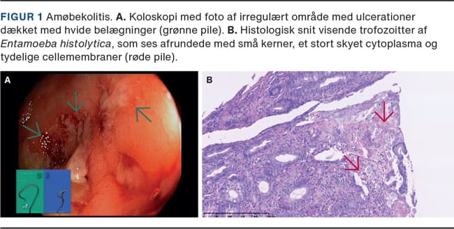 En 61-årig mand fik i forbindelse med koloskopi, der blev udført pga. en positiv screeningtest for kolorektal cancer, påvist et malignitetsuspekt område i caecum (Figur 1A). Området blev biopteret og prøverne sendt til histologisk undersøgelse. Efterfølgende CT af abdomen viste en uskarp afgrænset tumorproces i caecum samt øget vægtykkelse omkring valvula. Der blev ikke påvist forstørrede lymfeknuder eller tegn til ekstraintestinal disseminering ved CT af thorax og abdomen. Patienten havde ingen gastrointestinale symptomer eller øvrige gener forud for fundet. Ved histologisk undersøgelse fandt man ulcerativ inflammation i slimhinden. I ulcusmaterialet luminalt sås trofozoitter med udseende som E. histolytica (Figur 1B). Flere af trofozoitterne indeholdt røde blodlegemer intracytoplasmatisk. Slimhinden var uden neoplastiske forandringer. Der forelå ingen parakliniske infektionstal. Fundet blev konfereret med infektionsmedicinere, og der blev påbegyndt behandling med peroralt administreret metronidazol 500 mg × 3 i ti dage. I fæcesprøver, der blev indsendt i forbindelse med udredningen, blev der påvist E. histolytica med speciesspecifik realtidspolymerasekædereaktion.