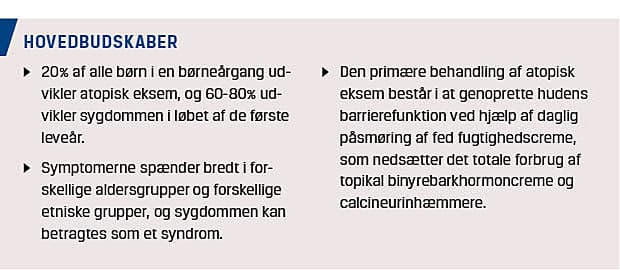 AE er blandt de hyppigste hudsygdomme i den vestlige verden. AE opstår på grund af en medfødt eller tidlig hudbarrieredefekt, som efterfølges af immunologiske og hudbarriereforringende kædereaktioner. Symptombilledet viser stor heterogenitet i forskellige aldersgrupper og etniske grupper, og AE bør betragtes som et syndrom. Førstevalg til behandling er fortsat topikal binyrebarkhormoncreme eller calcineurinhæmmere.
