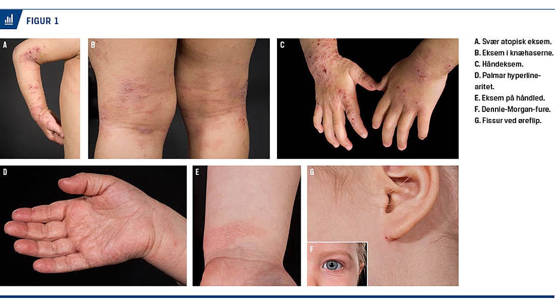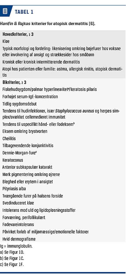 Børn og voksne med AE har en lang række forskellige kliniske manifestationer, og sygdommen betragtes derfor bedst som et syndrom (Figur 1 og Tabel 1). Det gennemgående træk er kronisk recidiverende eksem, tør hud, kløe og atopisk sygdom i nærmeste familie [6]. Dele af symptombilledet afhænger af patientens alder og etnicitet, hvilket bl.a. betyder, at det kliniske billede hos patienter med asiatisk og afrikansk afstamning kan være meget forskelligt. Eksem karakteriseres ved en uskarp afgrænset rødme, papeldannelse, skældannelse og mulig likenisering. I spædbarnsalderen ses eksemen primært i ansigtet, langs ekstremiteternes strækkesider og på truncus, mens børn fra ca. toårsalderen primært har eksem i bøjefurerne. Sidst i ungdommen og i alderdommen er eksemen primært lokaliseret til hoved-hals-regionen samt på hænder og fødder. Hyppigt anvendte diagnostiske kriterier er Hanifin & Rajka- eller UK-kriterierne [6, 7].