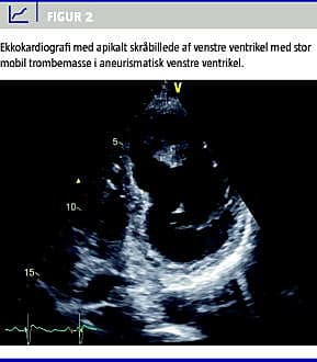 En ekkokardiografi viste dilateret venstre ventrikel med antero-apikal akinesi med aneurisme og en 2,5 × 1,5 cm stor mobil mural trombe (Figur 2 ). Venstre ventrikels pumpefunktion blev estimeret til 25-30%. Der var ingen klapabnormaliteter. Gentagne målinger af blodsukkeret (såvel fastende som ikkefastende) under indlæggelse lå på 5,1-6,0 mmol/l, hvorved underliggende diabetes blev afkræftet.