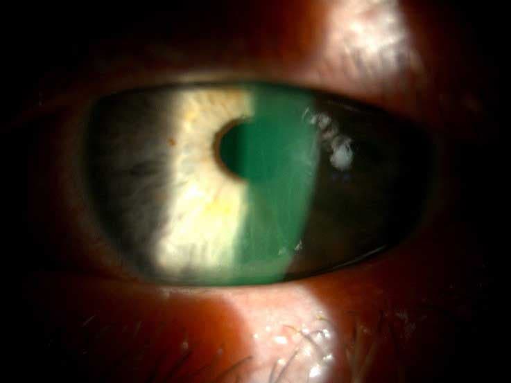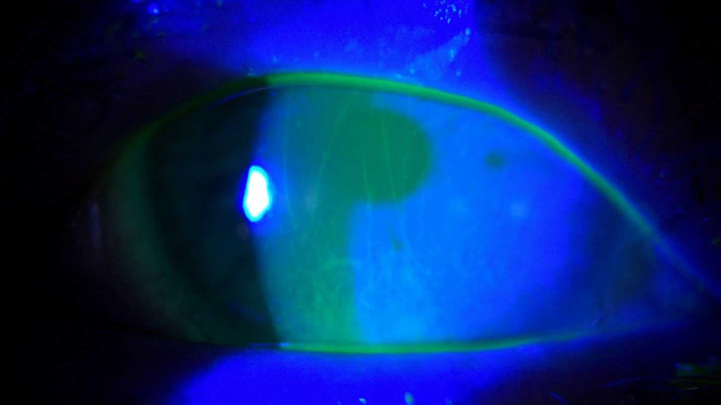 En 40-årig mand blev henvist fra Fælles Akutmodtagelse til vurdering af atypisk udseende abrasion i venstre øje. Patienten havde arbejdet med vinkelsliber dagen inden. Han vågnede om morgenen med kraftige smerter og synssløring i venstre øje. Han var lysfølsom, og øjet løb i vand.