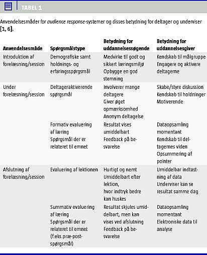 ARS kan anvendes før, under og efter en forelæsning. I Tabel 1 ses en oversigt over systemets forskellige anvendelsesmuligheder samt fordelene for uddannelsessøgende og undervisere [1, 6].