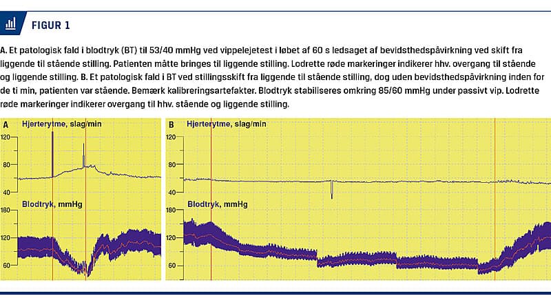 To år efter debut fik patienten gentaget vippelejetest. Resultatet var i det væsentlige uændret med bastant blodtryksfald ved stillingsskift (Figur 1B). Hun viste sig dog at være bedre i stand til at modstå blodtryksfaldet og kunne stå op hele testen ud, i ti min.