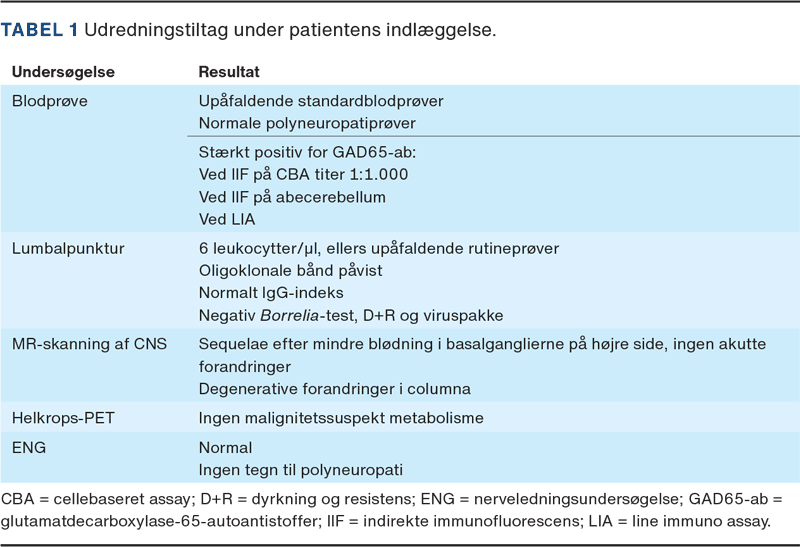 Efter ca. en måned blev patienten på ny henvist fra egen læge grundet tiltagende gangproblemer og snøvlende tale. Der var nu objektivt tilkommet let dysartri, nystagmus, fortsat opbrudte øjenbevægelser samt udtalte balanceproblemer med bredsporet gang. Patienten blev indlagt til videre udredning (Tabel 1). Under indlæggelsen udviklede patienten tiltagende ataksi i alle fire ekstremiteter. De diagnostiske overvejelser var bl.a. paraneoplastisk neurologisk syndrom (PNS), Miller Fisher syndrom og lattergasmisbrug.
