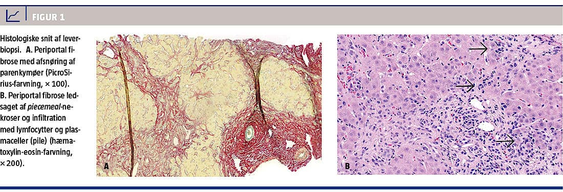 Efter to måneder var BILI-niveauet normaliseret, men pga. vedvarende parenkymatøs leverpåvirkning med et ALAT-niveau på 222 E/l blev der foretaget leverbiopsi. Denne viste kronisk hepatitis med fibrosegrad 3 og moderat inflammatorisk aktivitet, hvilket var foreneligt med AIH (Figur 1). Med baggrund i biopsisvaret blev der iværksat behandling med budesonid 9 mg × 1 dagligt, hvilket normaliserede levertallene i løbet af få uger.