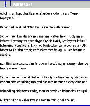 Autoimmun hypophysitis er en sjælden sygdom, hvor der udvikles inflammation i hypofysen. Sygdommen kan inddeles efter anatomisk klassifikation i tre former. Lymfocytær adenohypophysitis (LAH), lymfocytær infundibuloneurohypophysitis (LINH) og lymfocytær panhypophysitis (LPH) [3]. Af disse tre former er LAH den hyppigst forekommende, mens LINH er den mest sjældne. AH blev først beskrevet af Goudie & Pinkerton [4] i 1962, og siden da er 379 tilfælde med AH blevet rapporteret i litteraturen [1, 5, 6]. Incidensen er ukendt, og sygdommen formodes at være underestimeret, da den gennem tiden er blevet fejldiagnosticeret som hypofyseadenom og Sheehan syndrom [3]. Kendskab til AH er væsentligt, da sygdommen udgør en differentialdiagnose til hypofyseadenomer samt nonadenomatøse hypofyselæsioner. For at belyse de kliniske og patologiske kendetegn for denne sjældne sygdom præsenteres nedenfor en systematisk gennemgang af den litteratur, vi kan finde om emnet i dag.