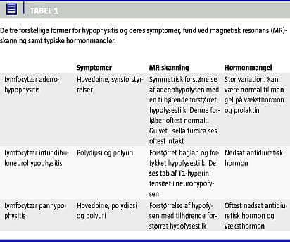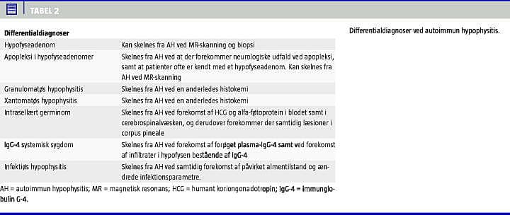 Hypofyseadenom og specielt klinisk non-secernerende adenom er de vigtigste differentialdiagnoser til AH, idet disse kan præsentere sig klinisk som AH med hovedpine og hypofyseinsufficiens, men dog ikke ADH-mangel (Tabel 2 ). Histologisk er de to sygdomme forskellige, men hypofysebiopsi er yderst sjældent indiceret ved mistanke om AH. De to sygdomme kan oftest skelnes ved MR-skanning. Ved hypophysitis ses oftest en symmetrisk forstørret kirtel, og ved gadolinium-administration ses en homogen kirtel. Derimod kan et makroadenom fremstå heterogent ved gadolinium administration, da et adenom i hypofyselejet typisk viser kontrastforskel mellem normalt hypofysevæv og adenomvæv. MR-skanningen af et makroadenom vil oftest vise en fejldisplaceret hypofysestilk og ofte ødelagt sellaegulv [3]. Ved AH fremstår hypofysen svagt ved et T1-vægtet billede og stærkt ved et T2-vægtet billede. Makroadenomer fremstår sjældent svagt ved T1-vægtede billeder og kan ved nogle tilfælde fremstå stærkt ved T2-vægtede billeder [14].