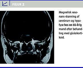 Glukokortikoider har vist sig effektive som behandling ved at reducere størrelsen af hypofysen samt fjerne inflammationen og derved normalisere hypofysens hormonsekretion [1, 6, 7].Hashimoto et al fandt, at behandling med glukokortikoider medførte reduktion af hypofysestørrelsen i ti ud af 16 patienter med AH [34]. Vi har beskrevet en patient, hvor symptomer på hypofyseforstørrelse svandt under glukokortikoidbehandling. Hypofyseforstørrelsen normaliseres på MR-skanning (Figur 1ogFigur 2) [35]. Der er også rapporteret tilfælde, hvor glukokortikoider ikke virkede [36, 37].Molitch et almener, at der mangler evidens for glukokortikoiders effekt i behandlingen af AH og finder, at den optimale behandling af AH vil være en delvis resektion af den forstørrede masse, således at trykket på de omkringliggende strukturer fjernes.