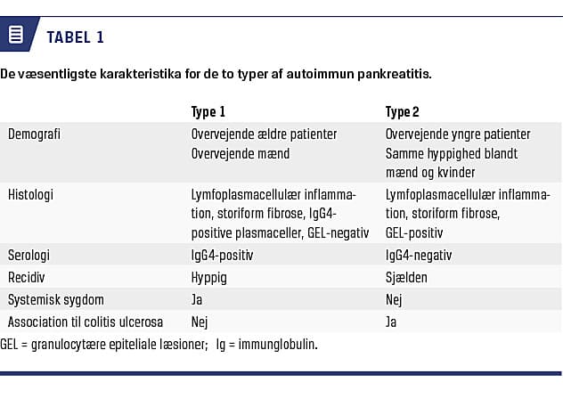 Der findes to typer af AIP. Type 1-AIP er en manifestation af den systemiske sygdom immunglobulin G4-relateret sygdom (IgG4-RS) med karakteristiske forandringer i flere forskellige organer. Type 2-AIP er en lokal sygdom, hvor forandringerne kun opstår i pancreas. Flere mænd end kvinder får type 1-AIP, og patienterne er ældre end patienterne med type 2-AIP. Patienter med type 1-AIP får hyppigere recidiv og har til tider manifestationer i andre organer. Endelig findes der forskelle i histologi og serologi [8-10] (Tabel 1).
