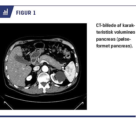 Ved billeddiagnostik ses der hos 40-60% af patienterne typiske forandringer, som karakteriseres af diffus forstørrelse af hele pancreas og forsinket opladning. Dette kaldes også en pølseformet pancreas (Figur 1). Hos 12-40% ses der endvidere en kapsellignende afgrænsning mod det omkringliggende væv – en halo. Atypiske forandringer ses hos 30-40% og kan være enten fokale eller multifokale. Oftest er disse forandringer lokaliseret til caput pancreatis og kan til tider være svære at differentiere fra pancreascancer. Endelig vil der være karakteristisk opladning i de forskellige faser. Ovenstående kan visualiseres ved CT, MR-skanning og PET [5, 19, 20]. UL-skanning af abdomen er mindre specifik, men kan dog bruges til påvisning af en hypoekkoisk diffus forstørret pancreas [5].