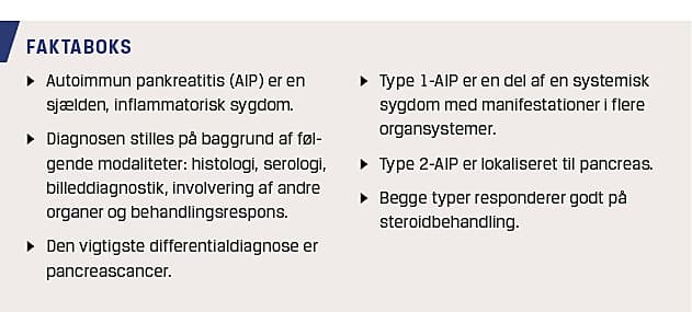 Autoimmun pankreatitis (AIP) er en forholdsvis ny sygdomsenhed. Histologisk er sygdommen præget af lymfoplasmacellulær inflammation og fibrose. Patogenesen er ukendt, men immunologiske mekanismer menes at spille en vigtig rolle. AIP blev første gang beskrevet kasuistisk i 1961 [1]. Viden om sygdommen accelererede i 1995, da Yoshida et al gennemgik ti tilfælde af kronisk pankreatitis publiceret siden 1961. De havde alle formodet autoimmun genese, og efterfølgende blev sygdommen kaldt for AIP [2]. Sidenhen er der kommet stadig mere viden om sygdommen. Der er på verdensplan udformet flere forskellige rekommandationer angående udredning og behandling. Med det formål at ensrette udredningen af AIP udarbejdede et internationalt ekspertpanel i 2010 »International Consensus Diagnostic Criteria for Autoimmune Pancreatitis« (ICDC for AIP) [3]. I et nyligt publiceret dansk studie har man fundet en incidens på fire tilfælde pr. år i Region Syddanmark (1,2 mio. indbyggere) og en prævalens på 2,5 pr. 100.000 indbyggere [4].